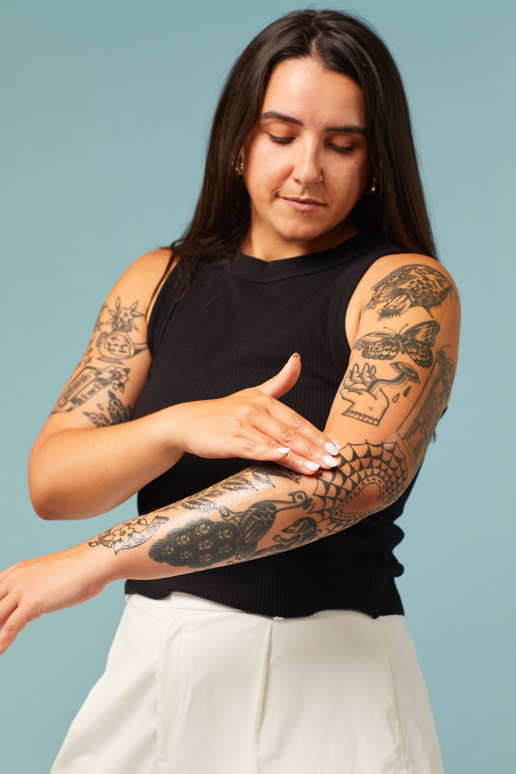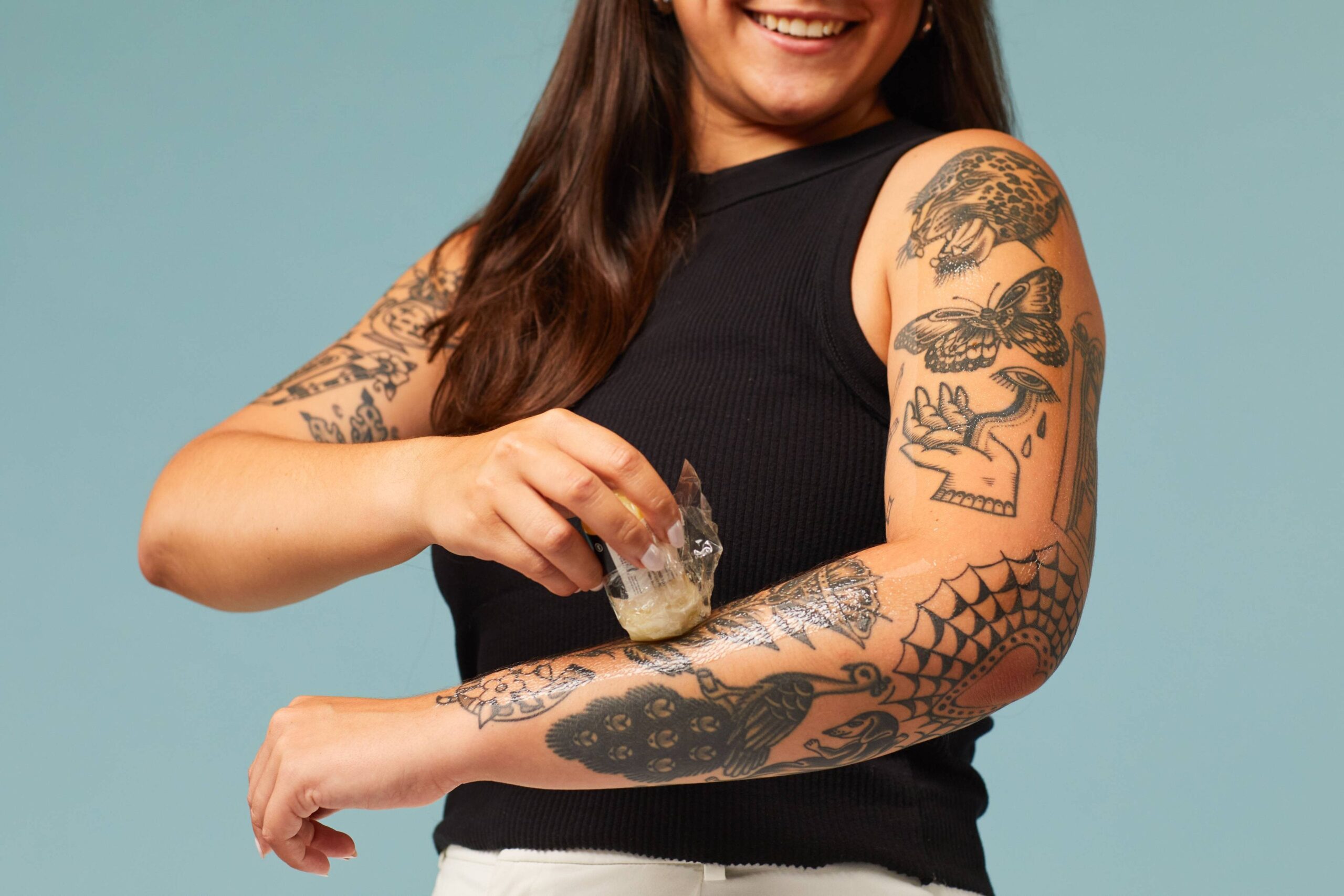 – Got ink? Glide this bar over healed tattoos to make color and detail pop
